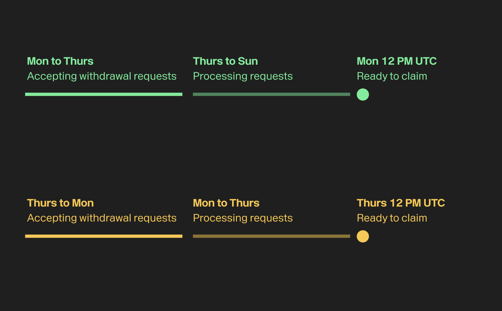 - Withdrawals requested between Monday 12:05 PM UTC and Thursday 12:05 PM UTC are processed and made available for claiming the following Monday at 12 PM UTC.